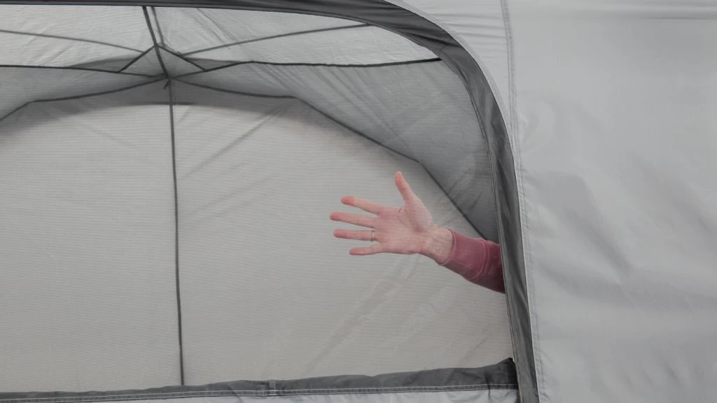 - Tent entrance has a mesh panel with a curtain for privacy