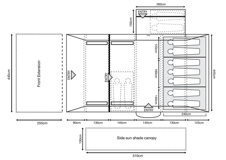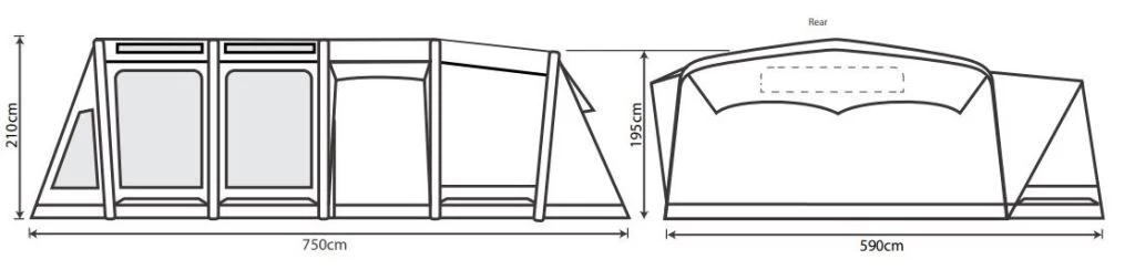 A maximum sleeping capacity of eleven can be reached should you choose to purchase a secondary optional two-berth inner tent. The parallel design of this porch area means that only a fraction of extra space is utilized at the side of the family tent.